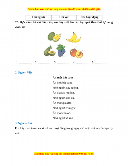 7*. Dựa vào tên các loại quả, em viết tên các loại quả theo thứ tự bảng chữ cái là: