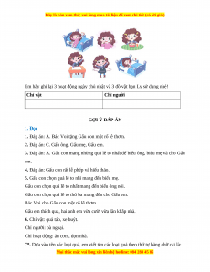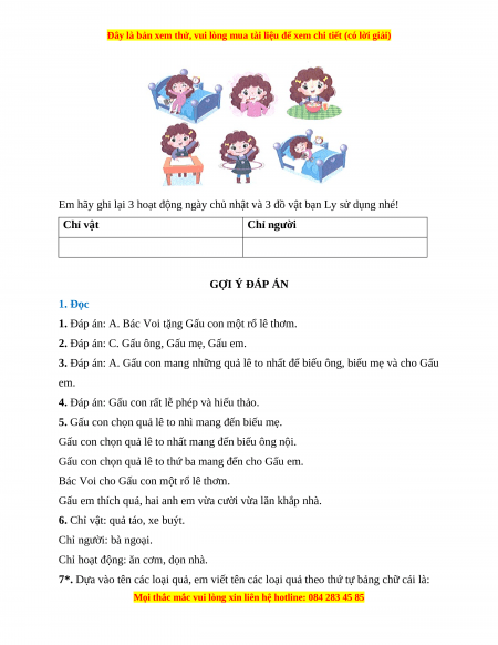 Em hãy ghi lại 3 hoạt động ngày chủ nhật và 3 đồ vật bạn Ly sử dụng nhé! Chỉ vật Chỉ người GỢI Ý ĐÁP ÁN 1. Đọc