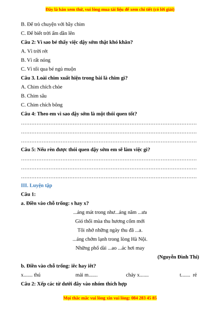 Câu 2: Vì sao bé thấy việc dậy sớm thật khó khăn? A. Vì trời rét B. Vì rất nóng