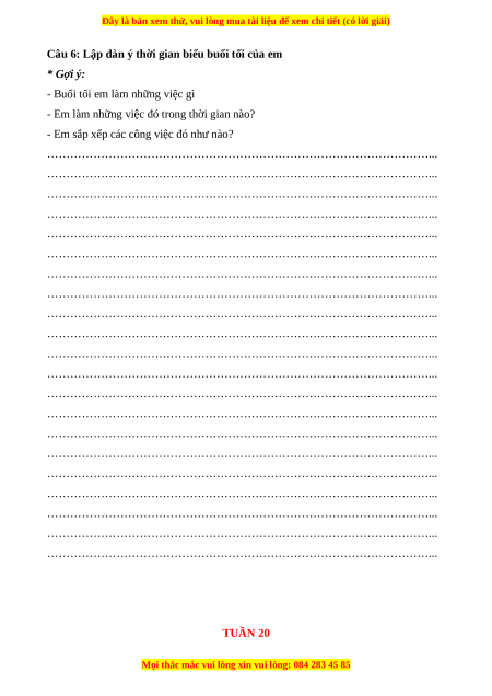 Câu 6: Lập dàn ý thời gian biểu buổi tối của em * Gợi ý: