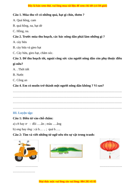 Câu 2. Trước mùa thu hoạch, các bác nông dân phải làm những gì ? A. cày bừa B. cày bừa và gieo hạt