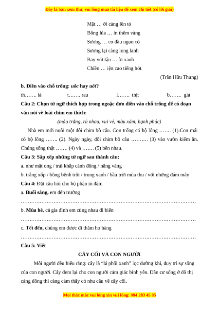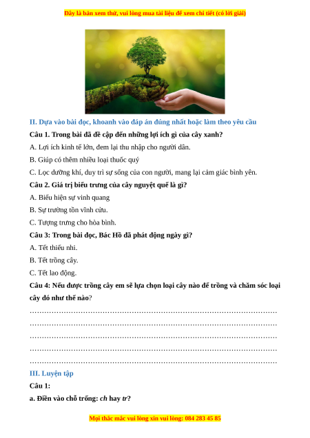 Câu 3: Trong bài đọc, Bác Hồ đã phát động ngày gì? A. Tết thiếu nhi. B. Tết trồng cây. C. Tết lao động.