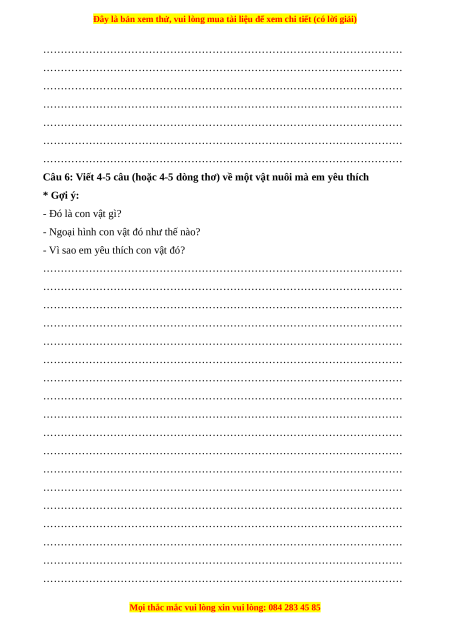 Câu 6: Viết 4-5 câu (hoặc 4-5 dòng thơ) về một vật nuôi mà em yêu thích * Gợi ý: - Đó là con vật gì?