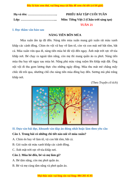I. Đọc thầm văn bản sau NÀNG TIÊN BỐN MÙA