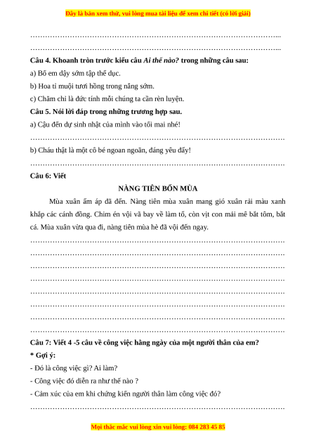 Câu 7: Viết 4 -5 câu về công việc hằng ngày của một người thân của em? * Gợi ý: