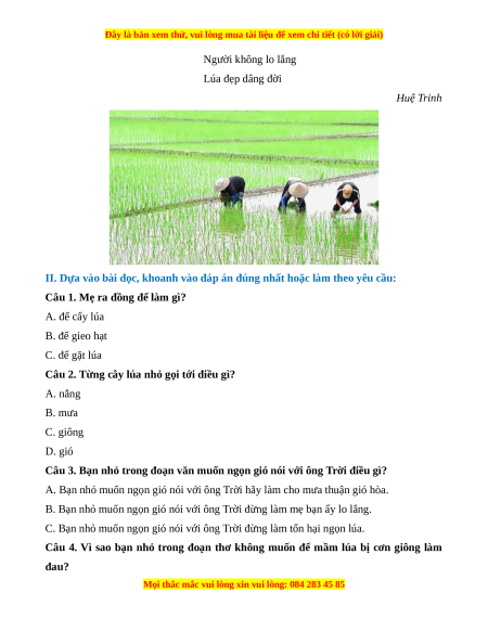 Câu 1. Mẹ ra đồng để làm gì? A. để cấy lúa B. để gieo hạt C. để gặt lúa