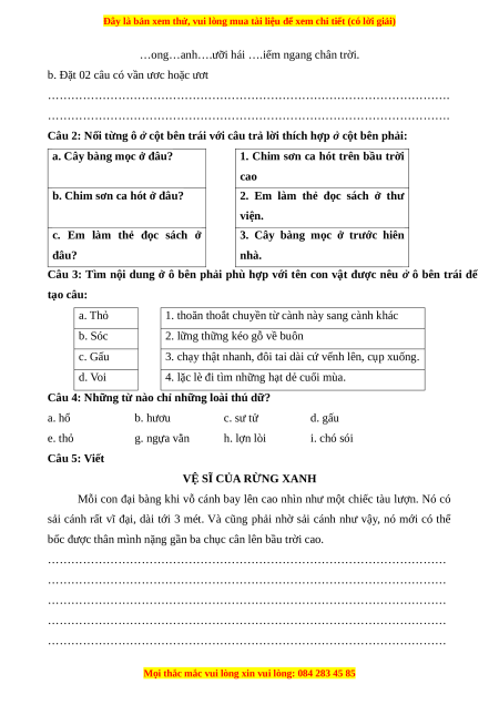 Câu 3: Tìm nội dung ở ô bên phải phù hợp với tên con vật được nêu ở ô bên trái để tạo câu: a. Thỏ