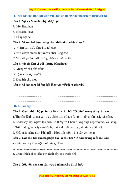 Câu 3: Vịt đã làm gì với những bông hoa? A. Mang về sân nhà mình B. Tặng cho mọi người C. Đưa hết cho mèo