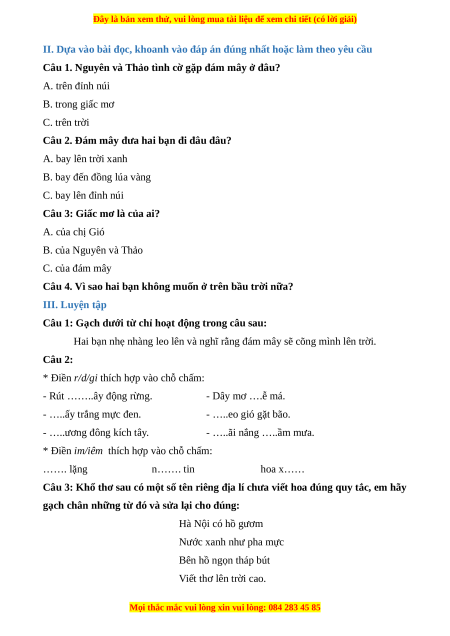 Câu 2. Đám mây đưa hai bạn đi đâu đâu? A. bay lên trời xanh