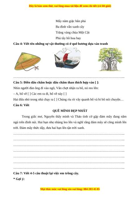 Câu 4: Viết tên những sự vật thường có ở quê hương dựa vào tranh