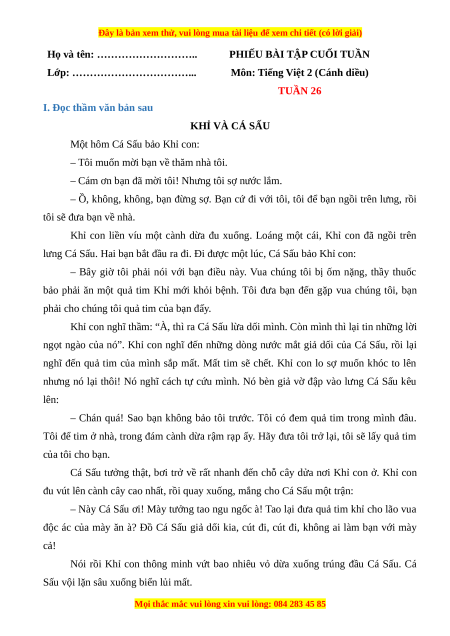 Môn: Tiếng Việt 2 (Cánh diều) TUẦN 26