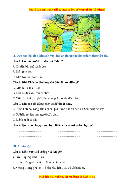 mình cho nước chớm bụng đến khi thấy khoan khoái (7) mát lạnh mới thôi (8) Câu 6: Viết KHỈ VÀ CÁ SẤU
