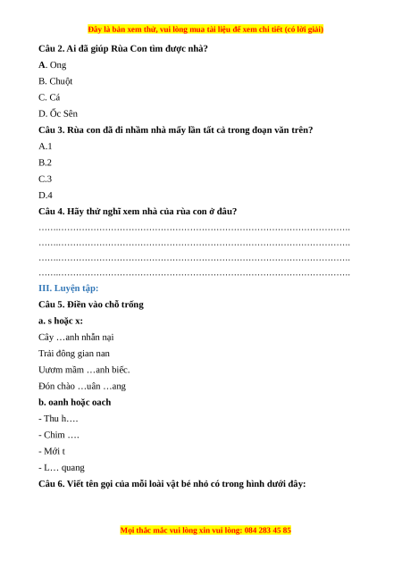 Câu 2. Ai đã giúp Rùa Con tìm được nhà? A. Ong B. Chuột C. Cá D. Ốc Sên