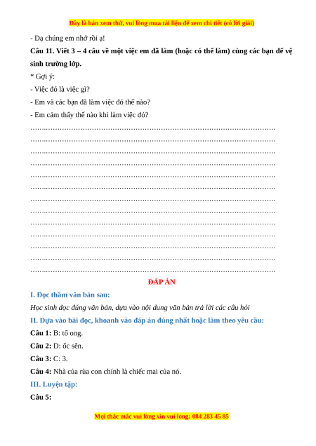 Câu 11. Viết 3 – 4 câu về một việc em đã làm (hoặc có thể làm) cùng các bạn để vệ sinh trường lớp. * Gợi ý: - Việc đó là việc gì?