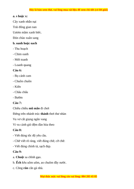 Câu 5. Điền vào chỗ trống a. s hoặc x: Cây …anh nhẫn nại Trải đông gian nan Uươm mầm …anh biếc. Đón chào …uân …ang b. oanh hoặc oach - Thu h…. - Chim …. - Mới t - L… quang
