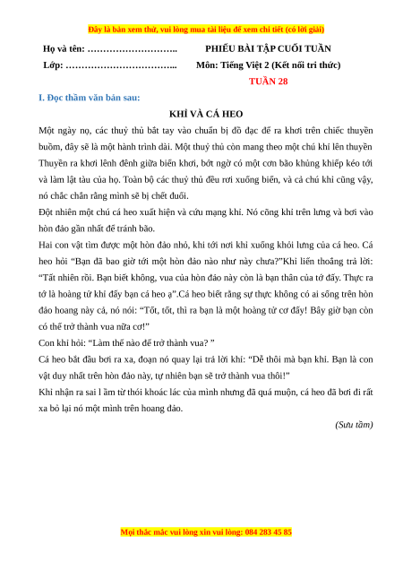 Môn: Tiếng Việt 2 (Kết nối tri thức) TUẦN 28