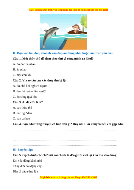 Câu 3. Ai đã cứu Khỉ? A. các thủy thủ B. bác ngư dân C. bạn cá heo