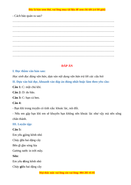 - Nếu em gặp bạn khỉ em sẽ khuyên bạn không nên khoác lác như vậy mà nên sống chân thành. III. Luyện tập: Câu 5: Em yêu giòng kênh nhỏ Chảy dữa hai dặng cây Bên dì dào sóng lúa