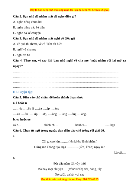 Câu 2. Bạn nhỏ đã nhắm mắt để nghe điều gì? A. nghe tiếng chim hót B. nghe tiếng các bà tiên C. nghe bà kể chuyện