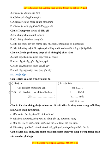 D. cành cây, ngọn cây, hoa, quả, gốc cây III. Luyện tập