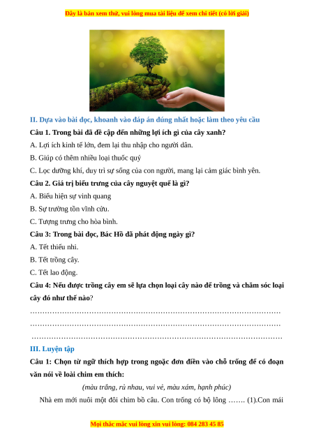 Câu 3: Trong bài đọc, Bác Hồ đã phát động ngày gì? A. Tết thiếu nhi. B. Tết trồng cây. C. Tết lao động.