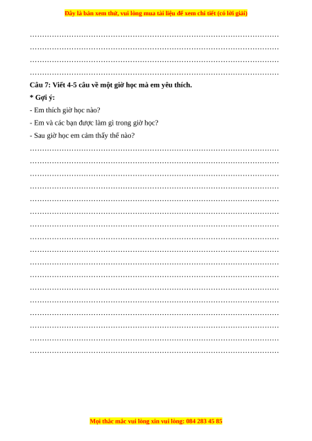 Câu 7: Viết 4-5 câu về một giờ học mà em yêu thích. * Gợi ý: - Em thích giờ học nào?