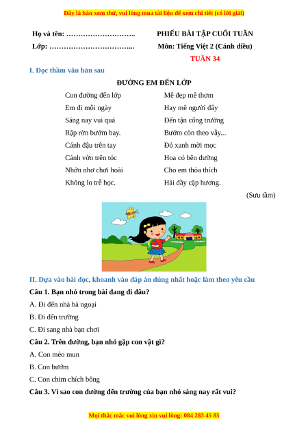 Câu 1: B. Đi đến trường Câu 2: B. Con bướm