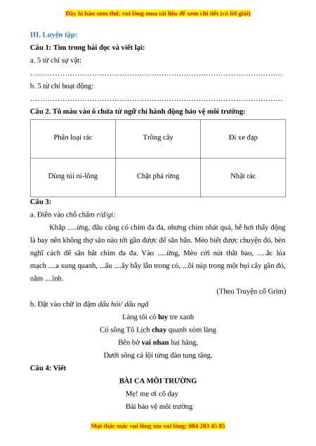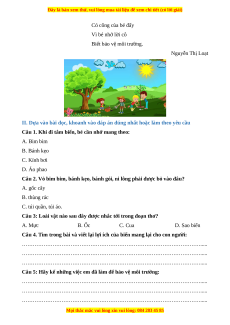 I. Luyện đọc văn bản sau BÀI CA MÔI TRƯỜNG Mẹ! mẹ ơi cô dạy Bài bảo vệ môi trường Mỗi khi đi tắm biển Phải nhớ mang áo phao. Không làm ồn gây ào Không vứt rác bừa bãi Vỏ bim bim bánh kẹo Vỏ bánh gói, ni lông Các bé nhớ nghe không Phải bỏ vào thùng rác Bỏ đúng nơi quy định