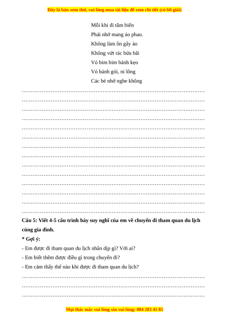 Câu 5: Viết 4-5 câu trình bày suy nghĩ của em về chuyến đi tham quan du lịch cùng gia đình. * Gợi ý: