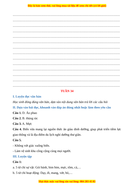 Môn: Tiếng Việt 2 (Chân trời sáng tạo) TUẦN 34