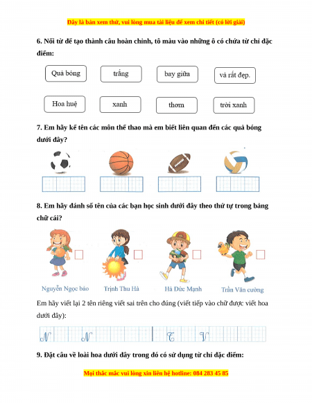 6. Nối từ để tạo thành câu hoàn chỉnh, tô màu vào những ô có chứa từ chỉ đặc