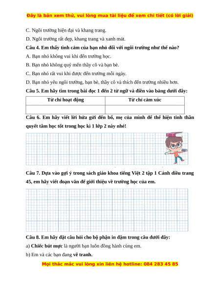 Câu 4. Đáp án: D. Bạn nhỏ yêu ngôi trường, bạn bè, thầy cô và thích đến trường