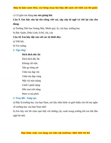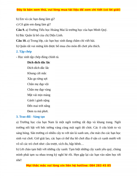 Câu 10. Em hãy đặt câu với các từ dưới đây: a) Viết bài. b) Vui mừng. 2. Tập chép Dích dích dắc lắc Dích dích dắc lắc Khung cửi mắc Xâu go từng sợi Chân mẹ đạp vội Chân mẹ đạp vàng Mặt vải mịn màng Gánh ì gánh nặng Đến mai trời nắng Đem ra mà phơi.