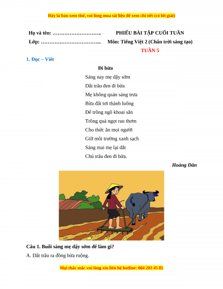 Câu 1. Đáp án: A. Dắt trâu ra đồng bừa ruộng.