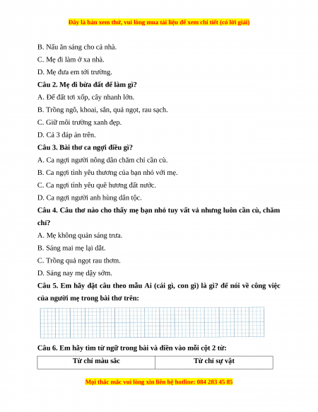 Câu 5. Công việc của mẹ là dắt trâu ra đồng bừa ruộng để trồng ngô, khoai, sắn,