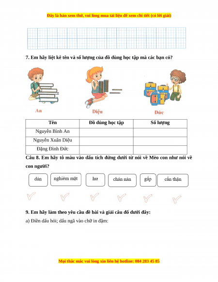 7. Em hãy liệt kê tên và số lượng của đồ dùng học tập mà các bạn có? Tên Đồ dùng học tập Số lượng Nguyễn Bình An Nguyễn Xuân Diệu Đặng Đình Đức
