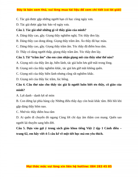 Câu 2. Đáp án: C. Dáng thầy cao, gầy. Giọng thầy trầm ấm. Tóc thầy đã điểm hoa