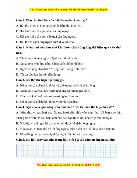 Câu 1. Đáp án: C. Bài thơ miêu tả vườn cây quả của ông ngoại.