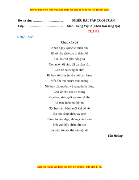 Môn: Tiếng Việt 2 (Chân trời sáng tạo) TUẦN 8 1. Đọc – Viết Cháu của bà