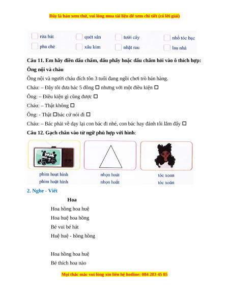 Câu 12. Gạch chân vào từ ngữ phù hợp với hình: 2. Nghe - Viết Hoa Hoa hồng hoa huệ Hoa huệ hoa hồng Bé vui bé hát Huệ huệ - hồng hồng Hoa hồng hoa huệ Bé thích hoa nào