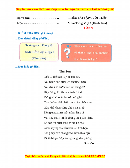 Môn: Tiếng Việt 2 (Cánh diều) TUẦN 9