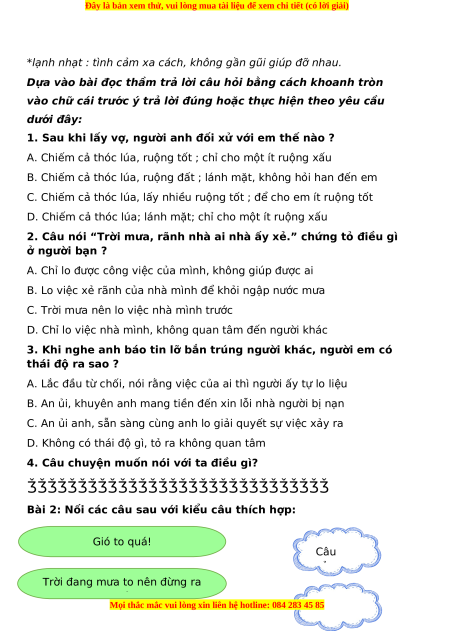 Dựa vào bài đọc thầm trả lời câu hỏi bằng cách khoanh tròn