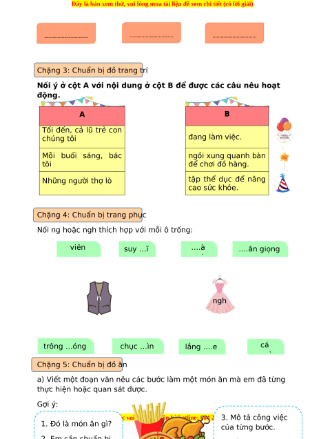 3. Mô tả công việc 1. Đó là món ăn gì? của từng bước. 2. Em cần chuẩn bị 4. Cảm nghĩ sau khi