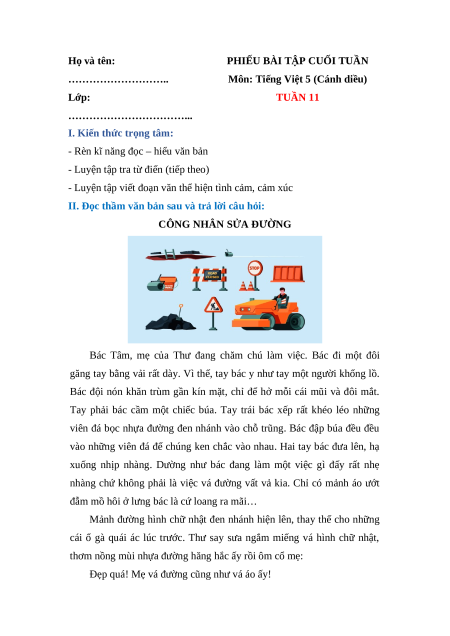 Bài tập cuối tuần Tiếng Việt lớp 5 Cánh diều Tuần 11