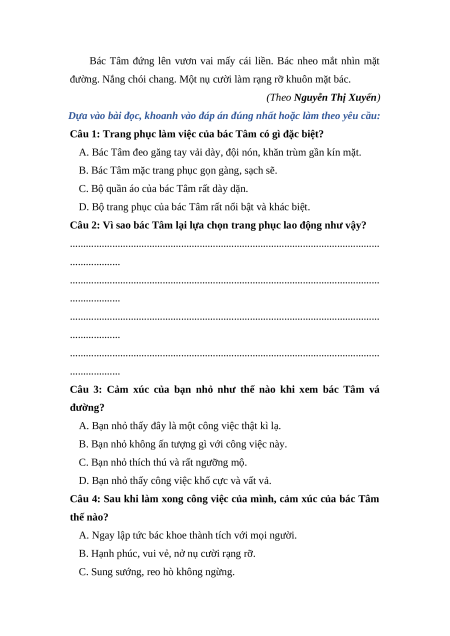 Dựa vào bài đọc, khoanh vào đáp án đúng nhất hoặc làm theo yêu cầu: