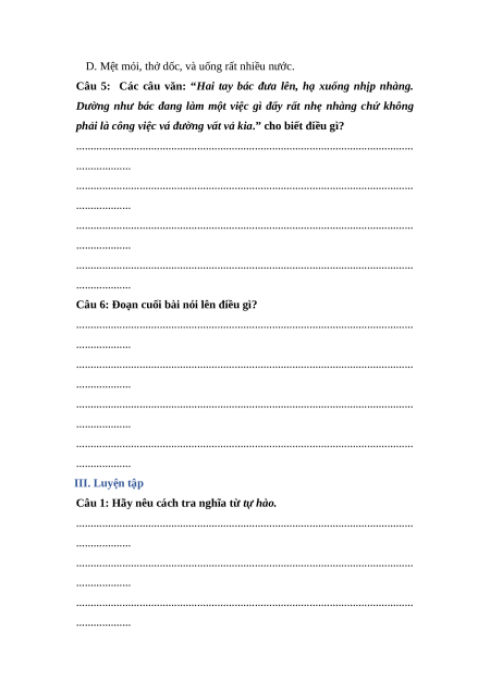 Câu 5: Các câu văn: “Hai tay bác đưa lên, hạ xuống nhịp nhàng.