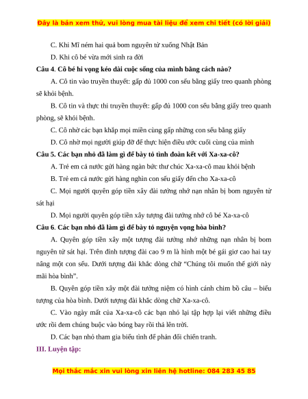 Câu 2. Cô bé còn may mắn sống xót nhưng bị nhiễm phóng xạ là ai? A. Tô-tô-chan B. Hi-rô-si-ma C. Na-ga-sa-ki D. Xa-xa-cô Xa-xa-ki