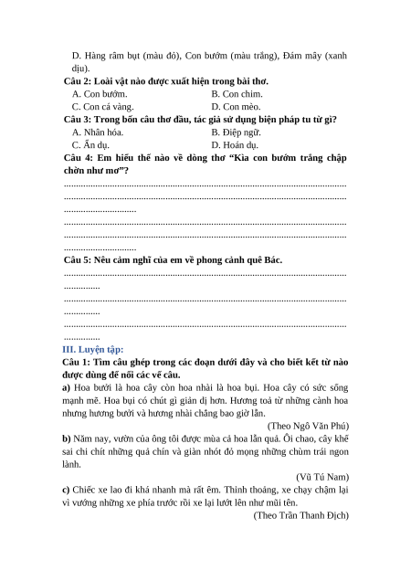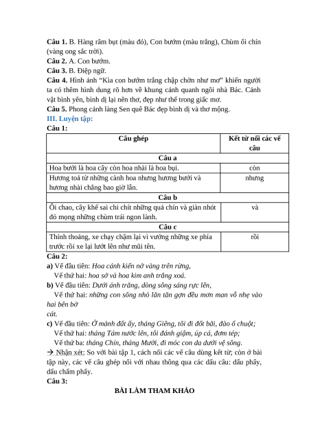 Câu 5. Phong cảnh làng Sen quê Bác đẹp bình dị và thơ mộng. III. Luyện tập: Câu 1: Câu ghép