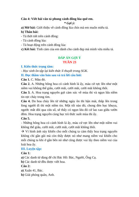 c) Kết bài: Tình cảm của em dành cho cảnh đẹp mà mình vừa miêu tả. ĐÁP ÁN GỢI Ý TUẦN 23