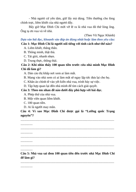 Câu 5. Nhà vua sai đem 100 quan tiền đến trước nhà Mạc Đĩnh Chi để